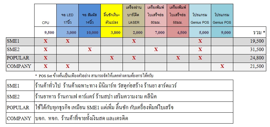 เรามีชุดอุปกรณ์ POS จำหน่ายทั้งแบบแยกชิ้น และจัดเป็นเซ็ท ให้เหมาะกับธุรกิจของคุณ เรายินดีให้คำปรึกษา จัดชุดในราคาที่ถูกที่สุดแต่ได้ประโยขน์สูงสุด อุปกรณ์ POS ประกอบไปด้วย เครื่องคอมพิวเเตอร์ ซอฟแวร์POS เครื่องอ่านบาร์โคด จอLCDแบบสัมผัส หรือจอLCDธรรมดา ลิ้นชักเงิน เครื่องพิมพ์ใบเสร็จย่อ ซึ่งแต่ละอย่างก็มีหลายแบบ หลายราคา ยากต่อการตัดสินใจ บางอย่างก็ไม่จำเป็น ทำให้มีต้นทุนที่สูงเกินความจำเป็น มาทำความรู้จักกับอุปกรณ์แต่ละชิ้นกันเลย